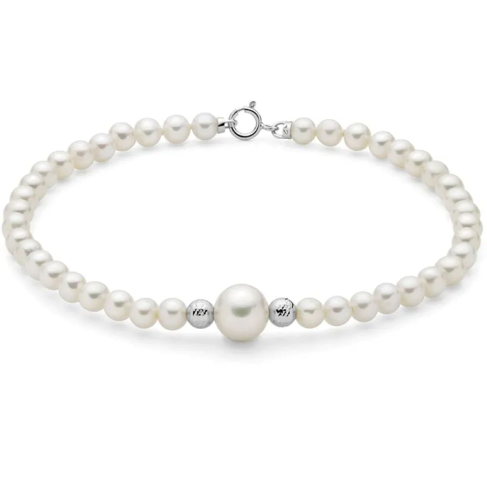 Il bracciale, realizzato con un filo di perle bianche coltivate di acqua dolce dal diametro di 4-4,5 mm.
