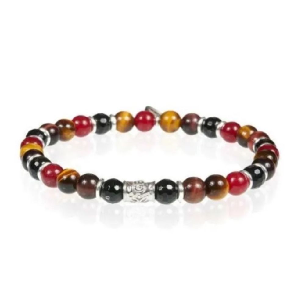 Bracciale elastico da Uomo caratterizzato da pietre naturali in occhio di tigre, onice nero ed agata rossa 6 mm con inserti in argento 925 placcatura rodio silver.