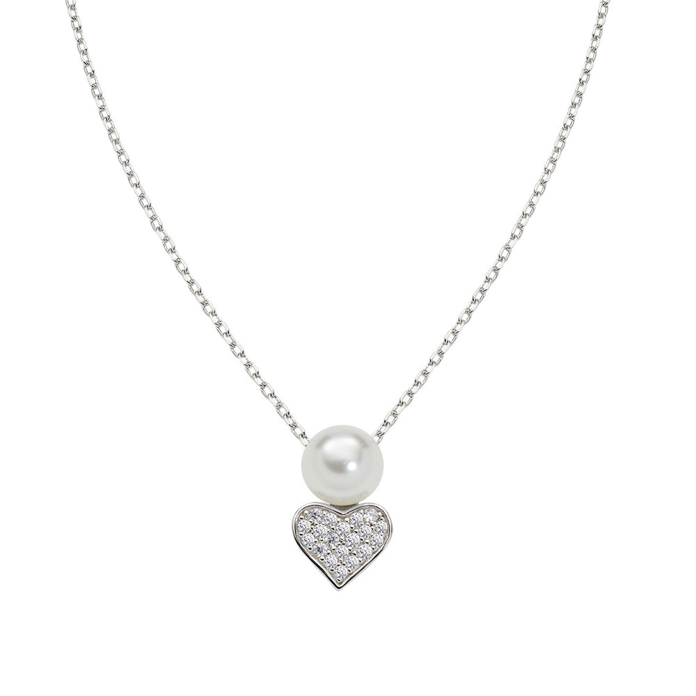 Collana in argento 925 rodiato, pendente con perla da 8 mm e cuore con pavé di zirconi bianchi.